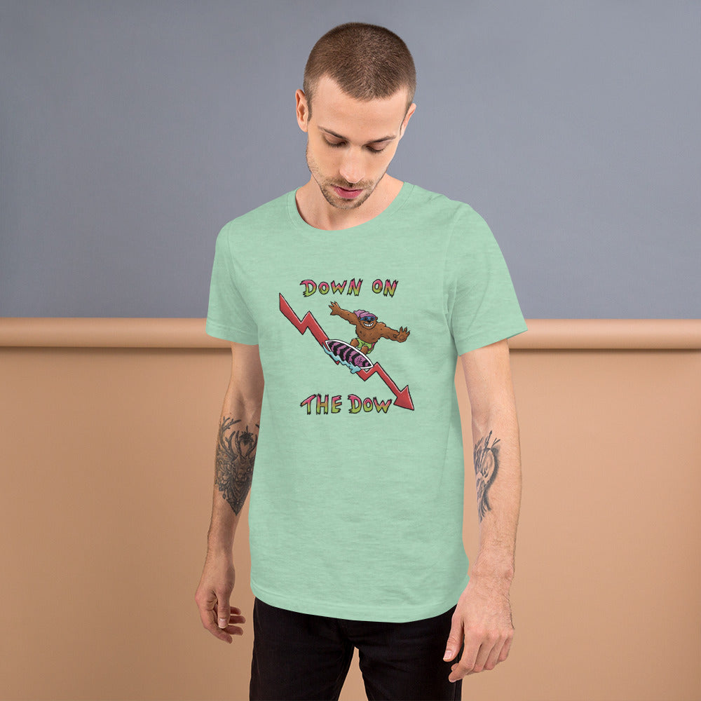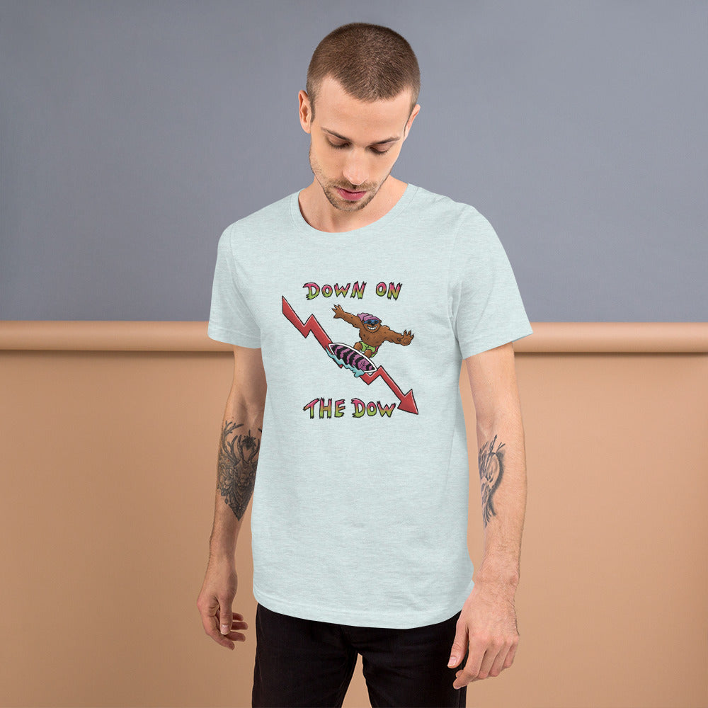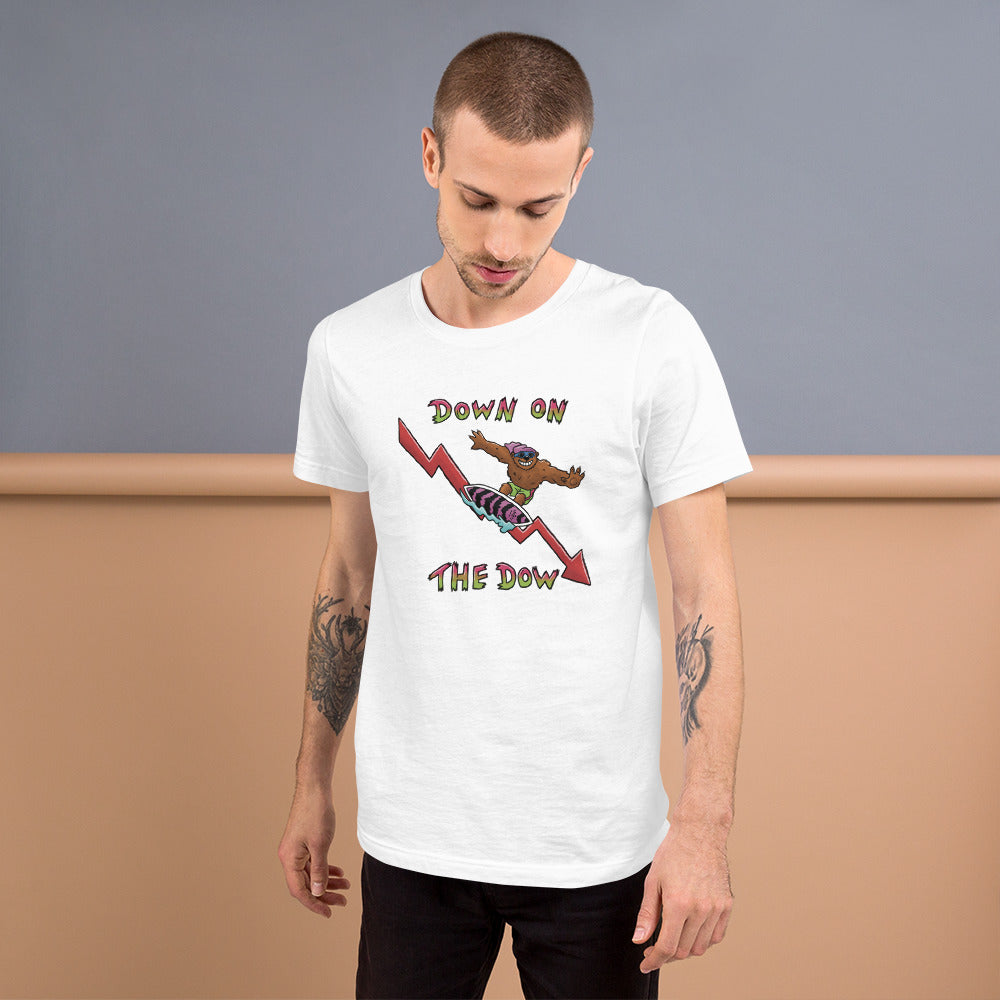 Perfect for anyone who loves a bit of nostalgia mixed with contemporary reality, the 'Down on the Dow' shirt is not just apparel; it's a badge of honor. It's for those who know that no matter how tough things get, we'll keep surfing through life with a smile on our faces and an unbreakable spirit. Grab this shirt, and show the world that while the Dow might be down, our spirits are always up!s