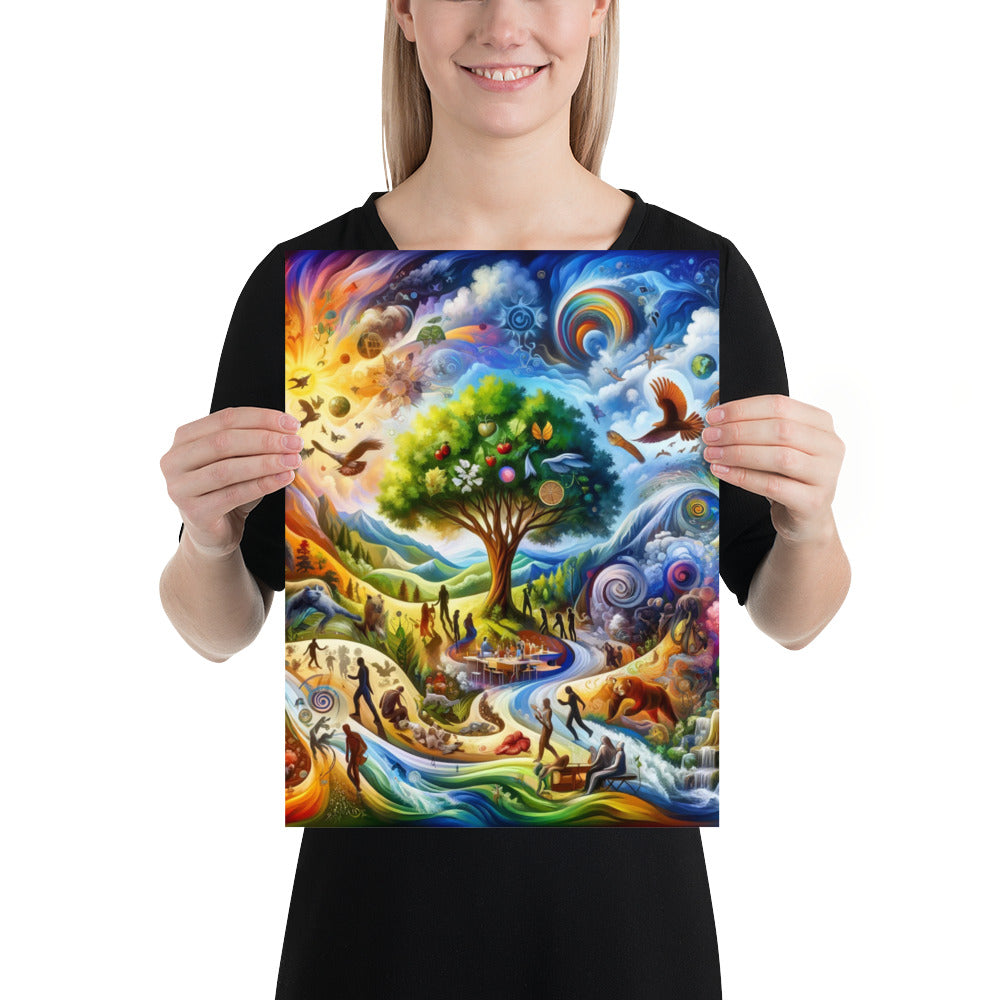 This vibrant image artistically encapsulates the essence of life, depicting a harmonious blend of nature, humanity, and the changing seasons. It symbolizes the interconnectedness of all living beings, from the flourishing tree and diverse wildlife to people of various ages and backgrounds. The seamless transition from mountains to plains, and rivers to seas, underscores the unity and continuity of life. This depiction invites reflection on the meaning of life, suggesting it might lie in the rich tapestry of experiences, relationships, and the natural world, all coexisting in a delicate balance, each element essential to the whole.